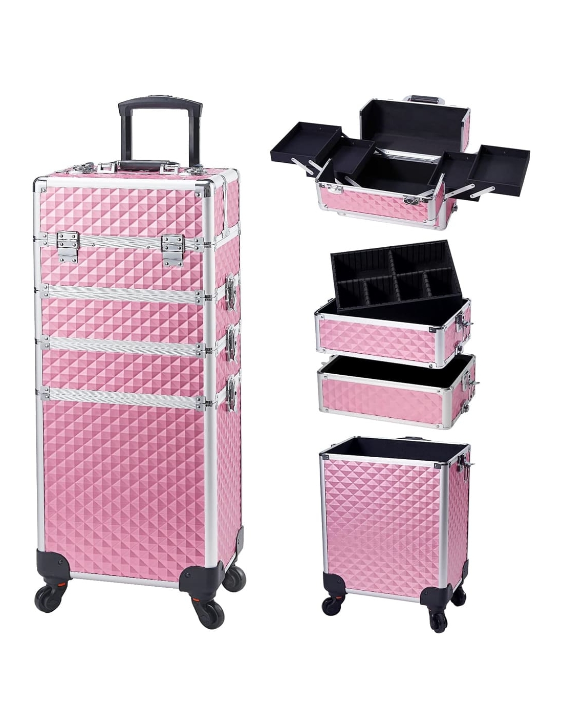 Trolley Grande in Alluminio Professionale composto da 4 scomparti rimovibili che possono essere combinati in base alle esigenze. Il telaio è in alluminio rinforzato e ha una struttura di alta qualità, che garantisce una resistenza superiore e la massima protezione per i tuoi prodotti, anche grazie alla serratura di sicurezza. Completamente esteso, l'altezza raggiunge i 95,5 cm. Le dimensioni sono 34 x 24,5 x 69,5 cm (questa altezza non comprende le ruote)