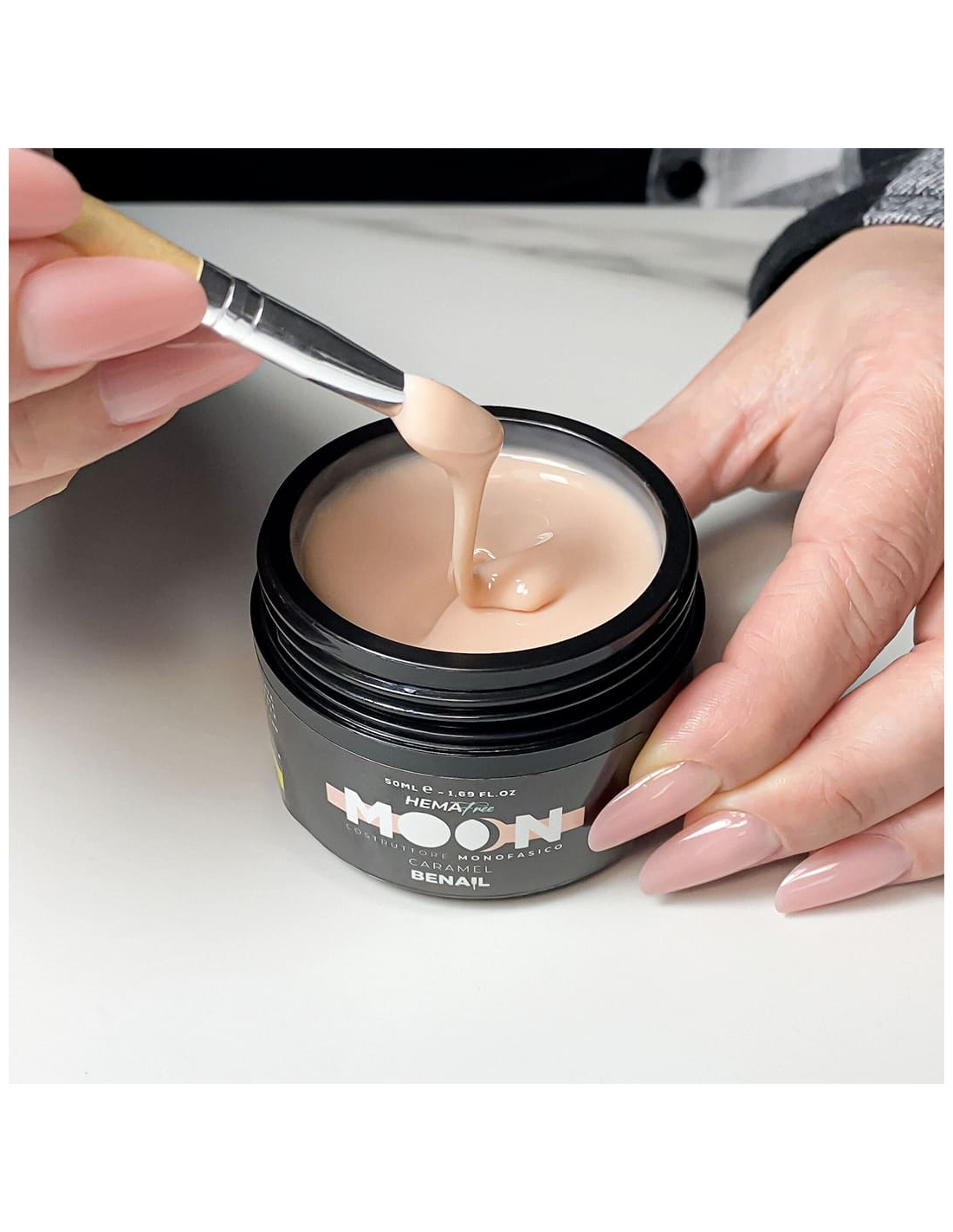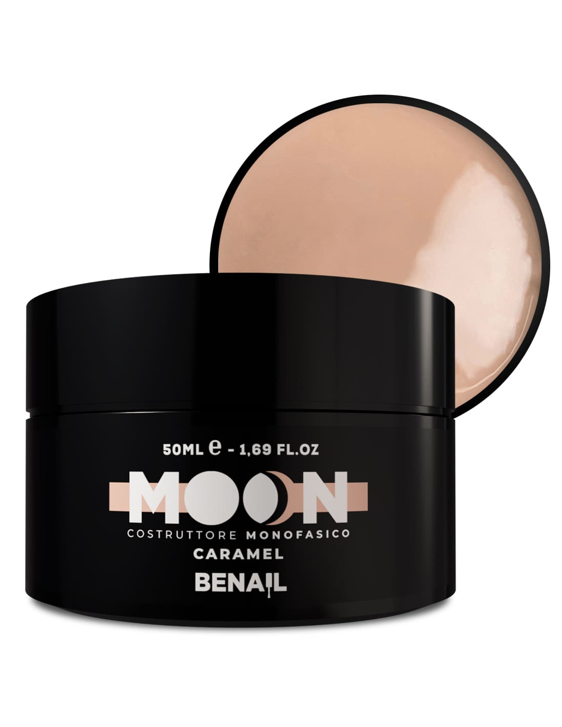 Il Moon Caramel è un gel costruttore monofasico a media densità, ideale per: ricostruzioni, coperture, refill, semipermanente rinforzato e Baby Boomer. Estremamente performante anche su unghie fragili o sottili, offre una struttura stabile, la sua formula autolivellante garantisce una stesura uniforme e precisa, riducendo i tempi di limatura e semplificando il lavoro. Non è indicato nei mesi estivi o in ambienti particolarmente caldi, in quanto il calore può renderlo troppo fluido e meno gestibile. In tali condizioni, si consiglia l’uso di gel costruttori tissotropici, più stabili anche ad alte temperature.