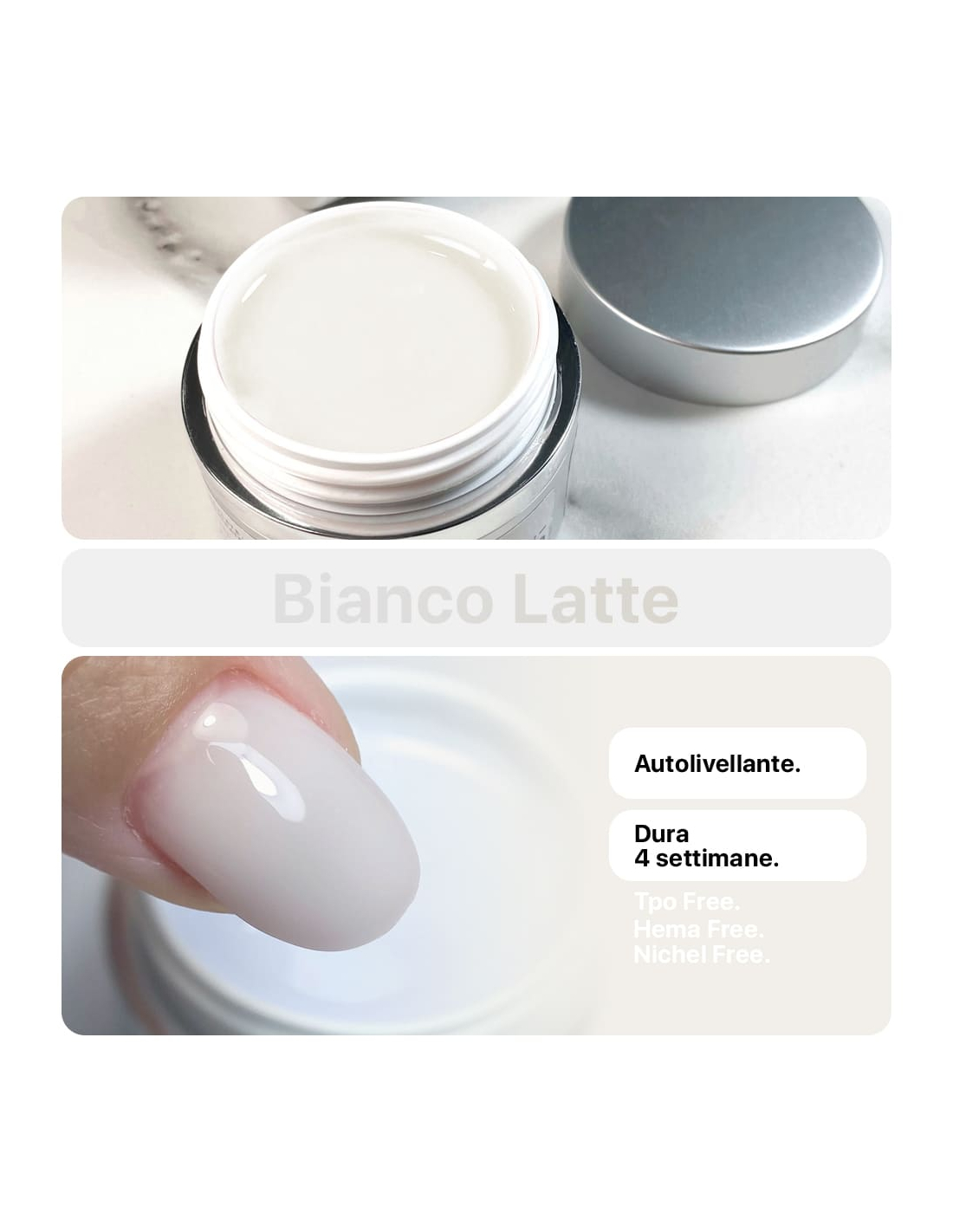 Il Gel Costruttore Trifasico Bianco Latte è un gel professionale autolivellante HemaFree a media densità, pensato per lavori di Ricostruzione, Copertura, Refill, Semipermanente Rinforzato e Baby Boomer. La sua formulazione con attivatori di aderenza e resina strutturale garantisce un'ottima performance tecnica e una durata elevata. Arricchito con Blue Reflex anti-giallo, evita ingiallimenti e alterazioni cromatiche, mantenendo inalterata la brillantezza dei colori applicati. Ideale anche come base trasparente per tonalità chiare o nail art.