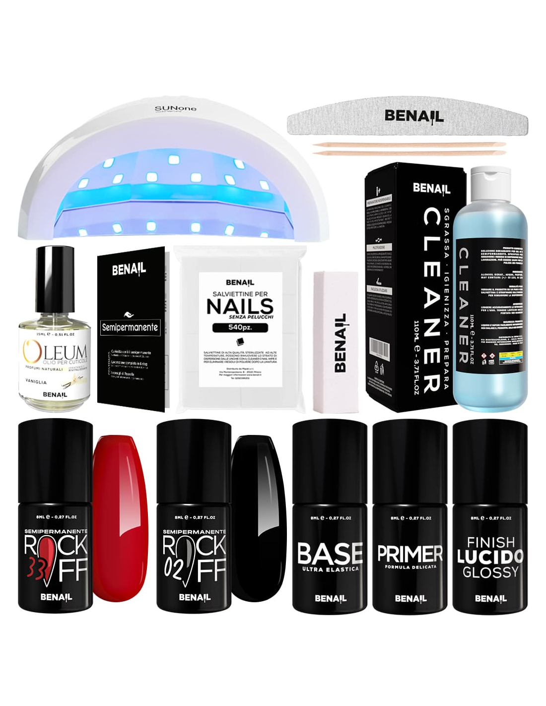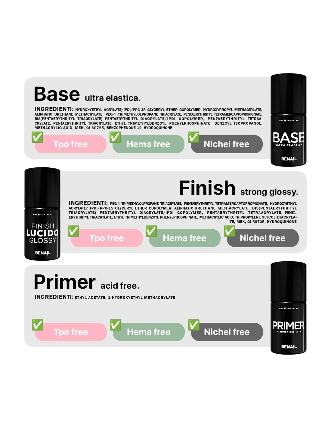 I prodotti Benail sono prodotti ad uso esclusivamente professionale conformi alle normative igienico-sanitarie vigenti in Europa e non contengono toluene, formaldeide e sono nichel free. Inoltre, non vengono effettuati test su animali e i prodotti sono registrati e certificati al portale CPNP. Inoltre, le formulazioni sono TPO free, DMTA free e senza CI 77820 (Argento).