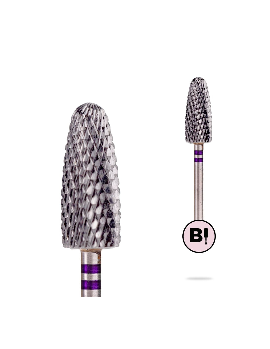 Punta fresa professionale in tungsteno con profilo flame e anello viola, progettata per smontaggi intensivi e rimozioni rapide di gel, semipermanente e acrilico con grana super grossa.