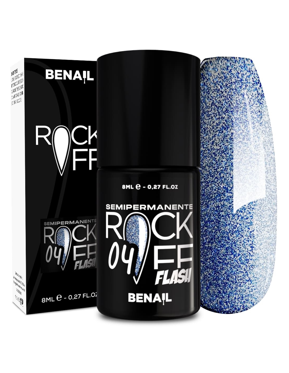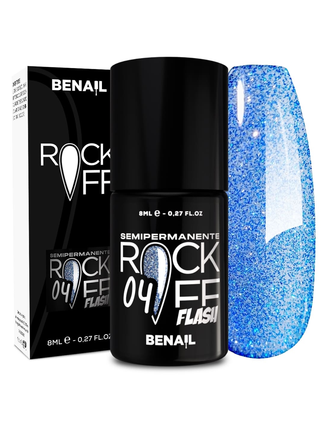 Rockoff Flash è uno smalto semipermanente ad alta pigmentazione, studiato e realizzato con una particolare formulazione ad oligomero composto che ne facilita l'applicazione ed evita la formazione di striature. Il prodotto è autolivellante, elastico e ha la caratteristica di illuminarsi sotto la luce del sole o di un flash, con una facile stesura garantita dal pennellino a setole larghe in dotazione. Per un ottima efficacia del semipermanente si consiglia di utilizzare il Finish Extreme Color Match per colori fluo e pastello, che contiene Sun Blocker utile per la protezione dai raggi solari; per i colori bianchi si raccomanda il Finish Puro White.