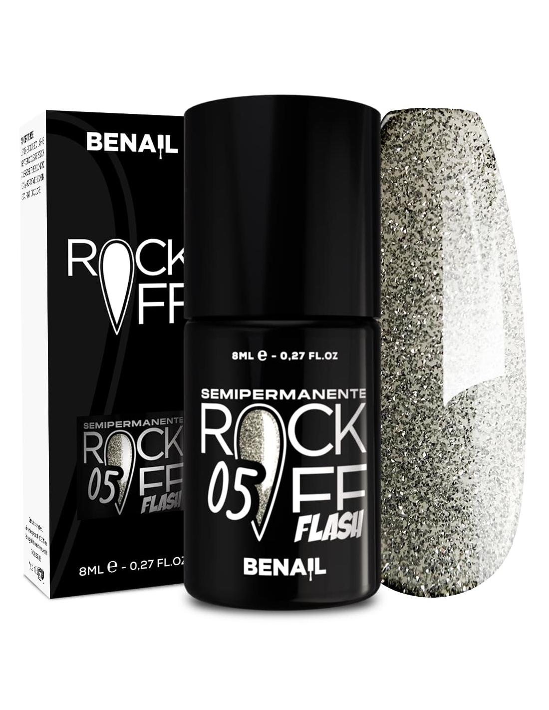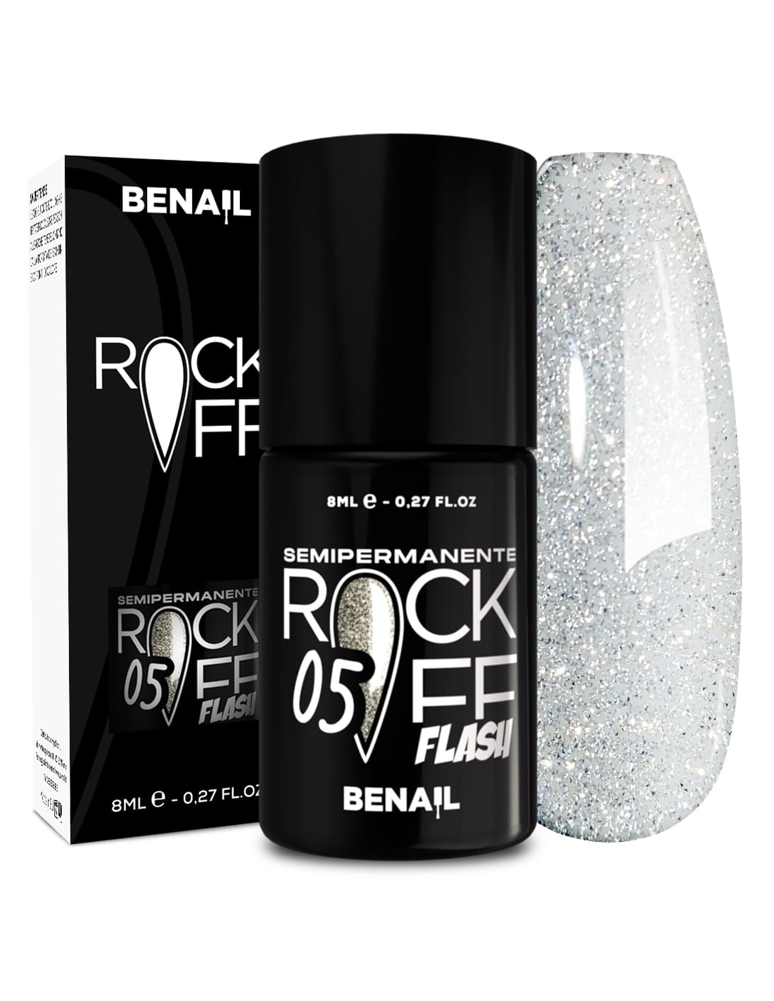 Rockoff Flash è uno smalto semipermanente ad alta pigmentazione, studiato e realizzato con una particolare formulazione ad oligomero composto che ne facilita l'applicazione ed evita la formazione di striature. Il prodotto è autolivellante, elastico e ha la caratteristica di illuminarsi sotto la luce del sole o di un flash, con una facile stesura garantita dal pennellino a setole larghe in dotazione. Per un ottima efficacia del semipermanente si consiglia di utilizzare il Finish Extreme Color Match per colori fluo e pastello, che contiene Sun Blocker utile per la protezione dai raggi solari; per i colori bianchi si raccomanda il Finish Puro White.