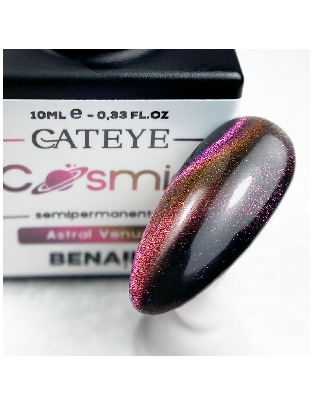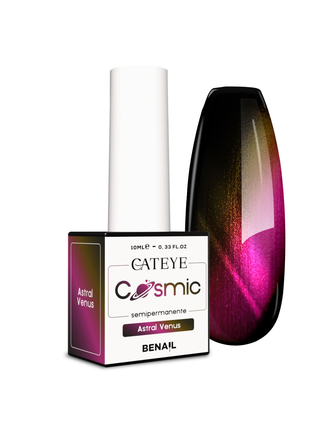 Lo Smalto Semipermanente Cat Eyes – Astral Venus è la scelta perfetta per chi desidera un effetto magnetico tridimensionale, brillante e profondo. La sua formula altamente pigmentata permette di ottenere una coprenza impeccabile sin dalla prima stesura, garantendo un risultato intenso e duraturo fino a 4 settimane. Grazie alla tecnologia “cat’s eyes”, potrai creare sfumature magnetiche personalizzate, giochi di luce sofisticati e un finish 3D che cattura lo sguardo.