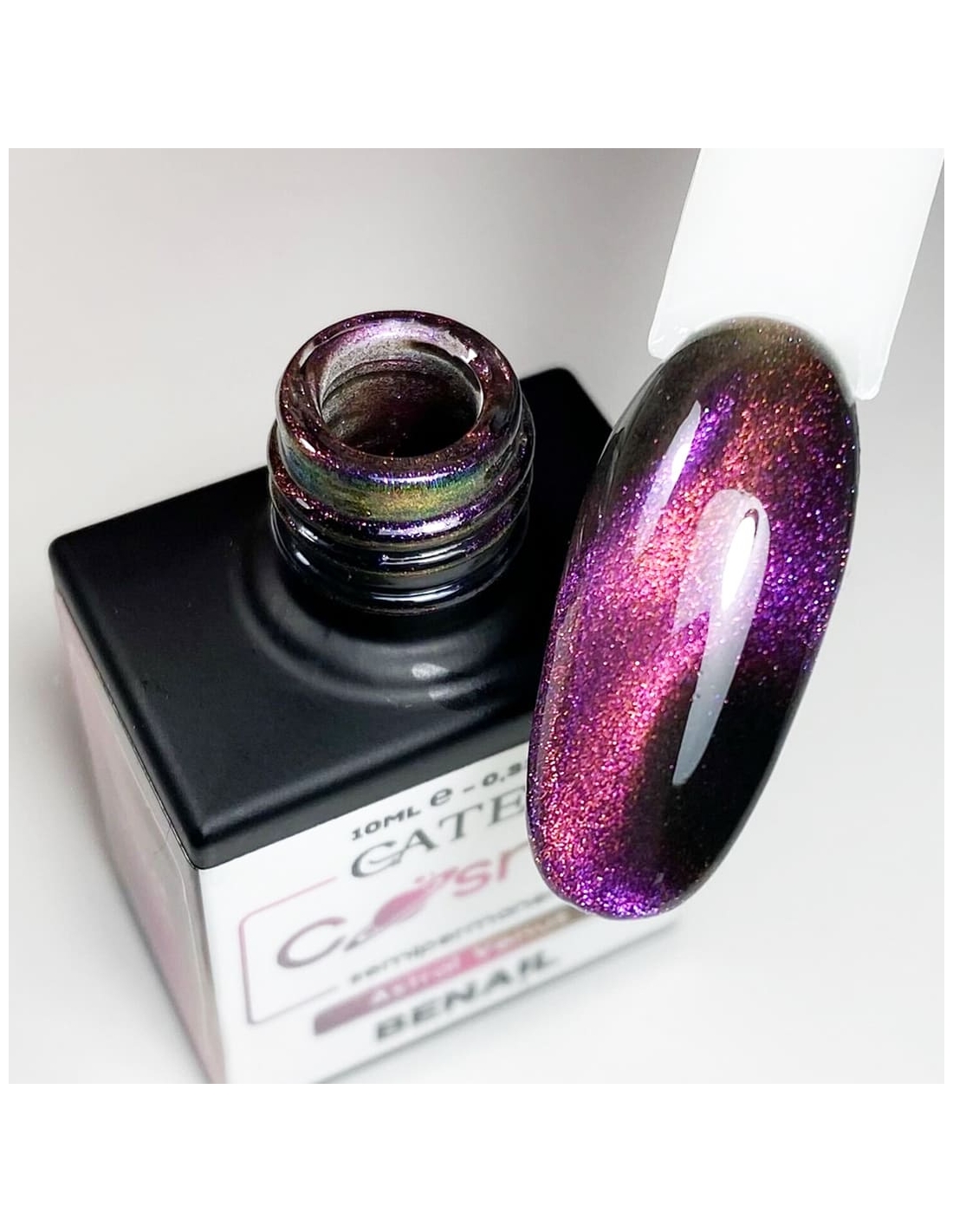 È ideale sia per applicazioni full color sia per valorizzare nail art e dettagli particolari. Per ottenere l’effetto magnetico è necessario utilizzare una calamita specifica per smalti Cat Eyes, che permette di orientare le particelle metalliche e realizzare un look 3D unico e luminoso